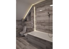 Na spratu se nalaze 3 spavaće sobe, 3 kupatila, garderober i iz jedne sobe se može pristupiti tavanu.